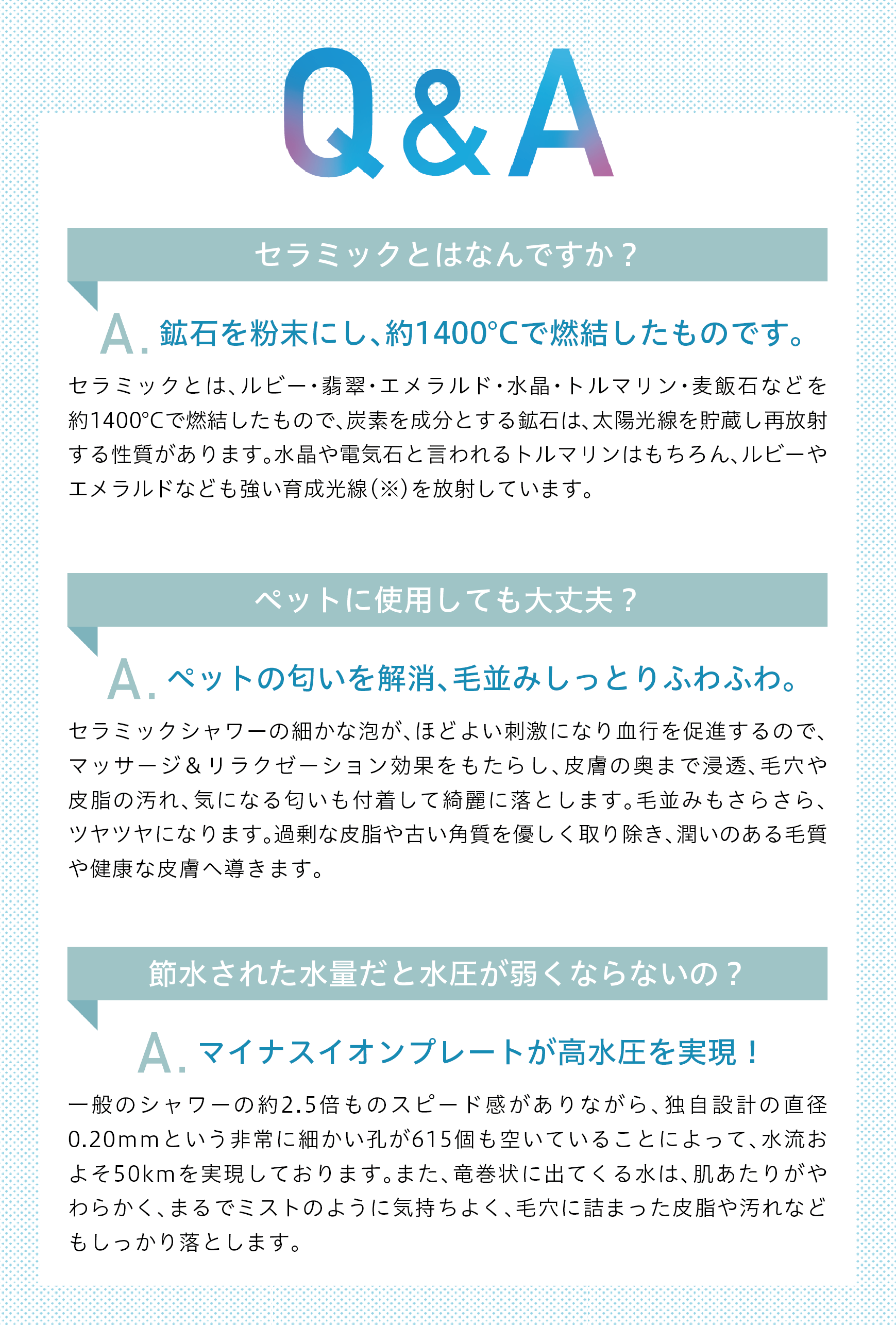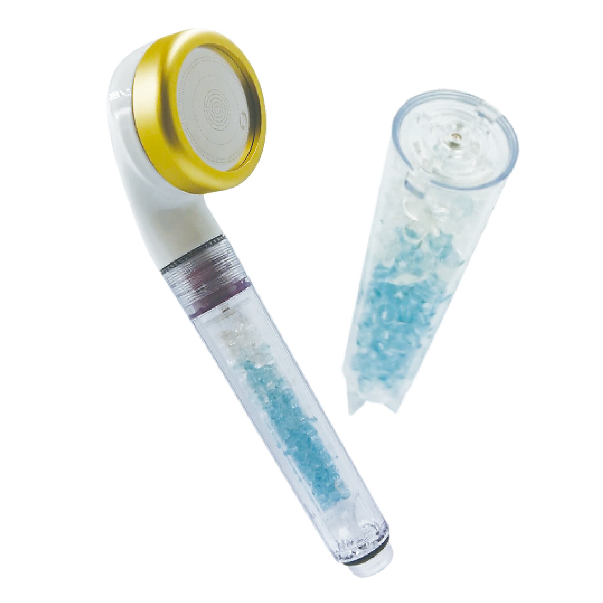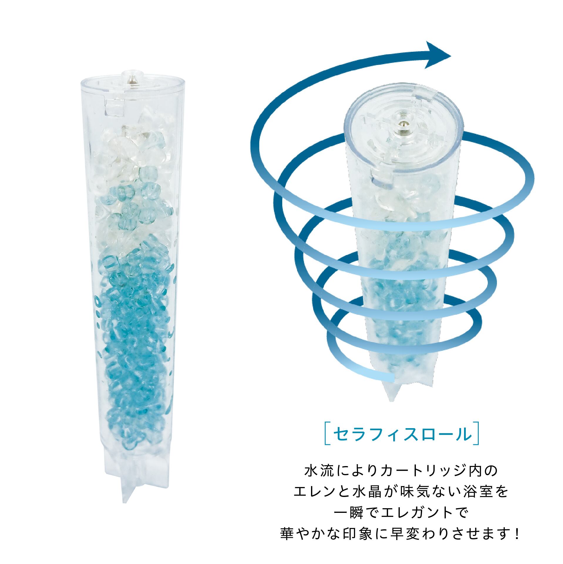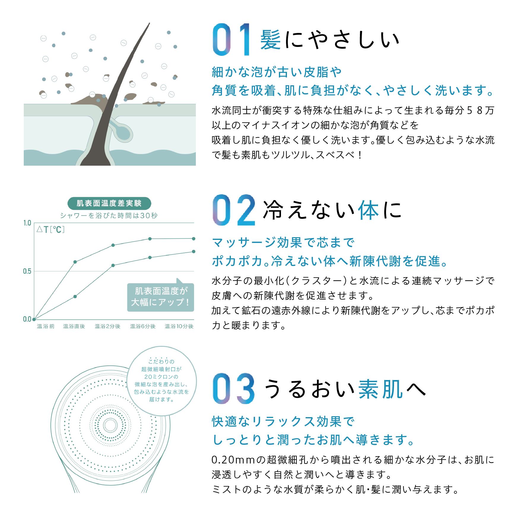 カートリッジ内臓のエレンセラミックガラスと水晶が水流を衝突させることにより、毎分58万以上のマイナスイオンの細かな泡が発生。