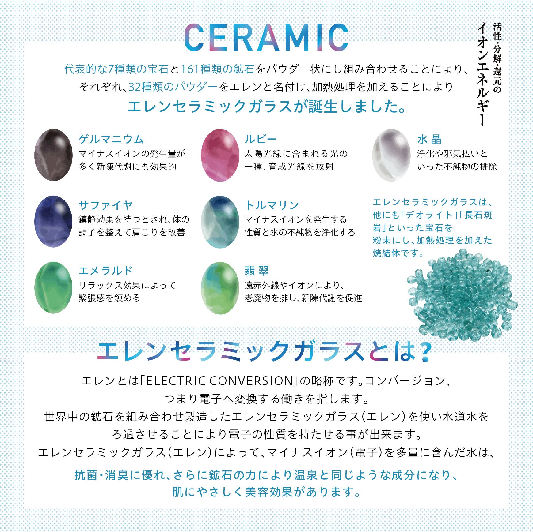 さらに、159種類の鉱石を含むエレンセラミックガラスが水道水を濾過することにより遠赤外線効果が加わり、老廃物を排し新陳代謝をアップ!!